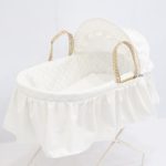 The Babycotton dressed palm moses basket with hood is appropriate for the baby’s first months and, thanks to its handles, is easy to carry from room to room. It consists of a wicker base, multi-position hood, mattress, coverlet, pillow and skirt.