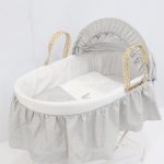 The Babycotton dressed palm moses basket with hood is appropriate for the baby’s first months and, thanks to its handles, is easy to carry from room to room. It consists of a wicker base, multi-position hood, mattress, coverlet, pillow and skirt.