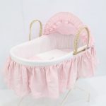 The Babycotton dressed palm moses basket with hood is appropriate for the baby’s first months and, thanks to its handles, is easy to carry from room to room. It consists of a wicker base, multi-position hood, mattress, coverlet, pillow and skirt.